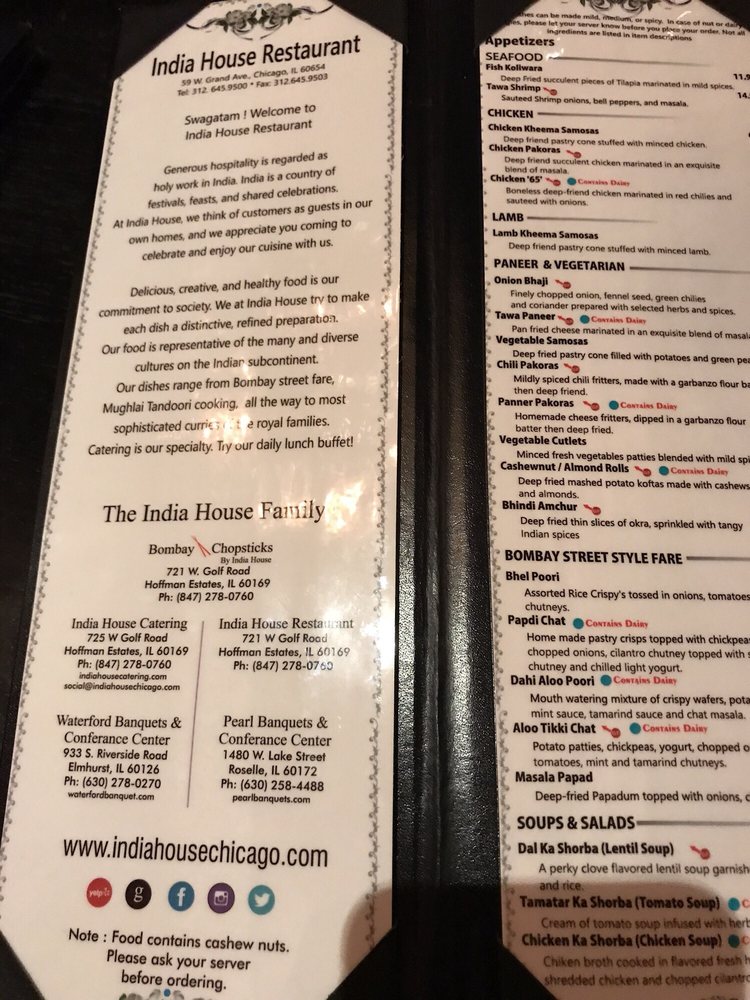 India House Restaurant located in Chicago, IL, offers an array of delightful dishes in a classy setting. From flavorful soups and salads to a variety of bread options, their menu caters to every palate. Start your meal with tantalizing starters like Aloo Tikki or Chicken Pakoras, followed by delicious mains such as Lamb Keema or Chicken Lunch. Don't miss out on their unique breads like Aloo Paratha or Chili Cheese Naan. The reviews praise the excellent food quality, friendly service, and inviting ambiance. Customers love the homemade mango ice cream and speciality dishes like Goat Korma and Butter Chicken. With a wide range of options including vegan and kid-friendly choices, India House Restaurant is a must-visit for a memorable dining experience.